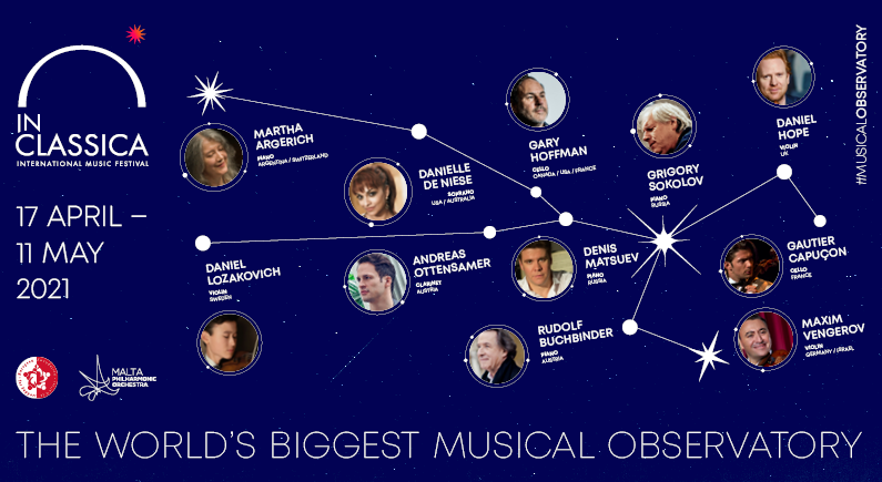 InClassica Malta International Music Festival will be happening on 17 April – 11 May 2021 and will welcome 33 Soloists including Martha Argerich, Rudolf Buchbinder, Gautier Capuçon, Danielle De Niese, Daniel Hope, Gidon Kremer, Denis Matsuev, Andreas Ottensammer, Grigory Sokolov and Maxim Vengerov among others.